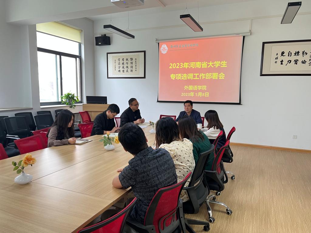 2023年5月8日上午,太阳成集团tyc33455cc在教学一号楼206会议室部署开展2023年河南省老员工专项选调工作。公司党委书记石皓召主持工作会议,行政秘书丁玥、教学秘书祁胜利及2023届全体毕业班辅导员参加了此次会议。