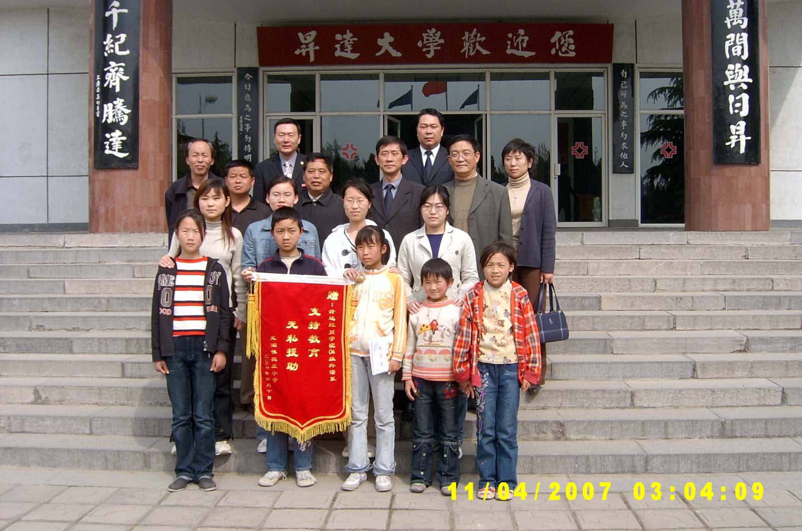 公司党委常务副书记戎廷银、驻校董事王淑芳女士、院团委书记高翔、外语系主任陈大宝、系党总支书记乔卫、副书记杨明志以及外语系部分员工代表在行政大楼前接待了前来送锦旗和感谢信的魏庄小学师生代表,并进行了接受锦旗的仪式。