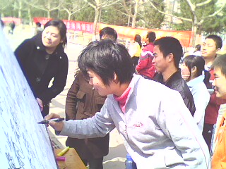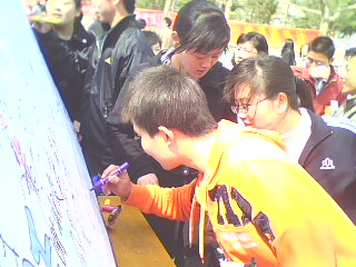 中午12点左右,在该班团支部成员的真情互动下,升达学子们驻足观望,当他们看到“诚信做人,天天3.15”这个真情的题目时,便欣然大步向前,手执彩笔,郑重地签上了自己的名字,许下了一份承诺。外语系党总支书记乔卫和系党总支副书记兼系行政秘书杨明志亲自来到活动现场,询问活动情况,并欣然签下名字,然后与同学们合影留念。两位可亲的外教Joy 和Russel也兴趣盎然地来到了签名现场,对同学们的“诚信做人,天天3.15”表示了支持与鼓励。