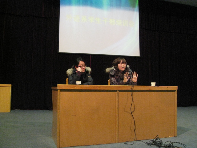 两位员工干部代表的发言之后王娟和赵杨两位老师用她们生动、幽默的语言向同学们阐述了她们的工作体会,以及工作中对班干部的要求。王娟老师指出员工干部要有自己的想法,肯动脑筋,使自己的想法新颖、有特色;赵杨老师谈到班干部要有责任心、有好的人品、要乐于奉献,要善于和辅导员老师配合为班级发展献计献策。
