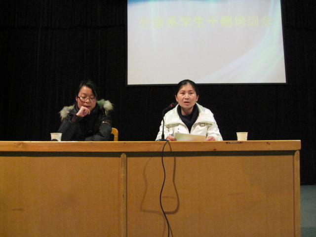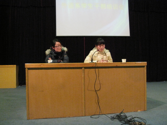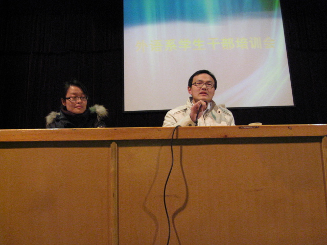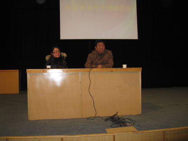 最后杨明志老师和马秉义主任分别对这次培训会做了总结。杨老师向大家介绍了学院的管理制度落实到班里的整个程序,使同学们认识到自己所处的位置,所担负的责任,并且勉励大家履行职责,严于律己,服务于广大同学,认真完成自己的学业,使自己更加优秀;马主任肯定了本次培训会的意义,肯定了同学们取得的成绩,同时也鼓励广老员工干部努力培养自己的奋斗精神,带动身边的同学努力成为“精外语、强听说、懂经贸”的外语人才。两位领导的讲话博得广大同学的阵阵掌声,最后培训会在热烈的气氛中结束。