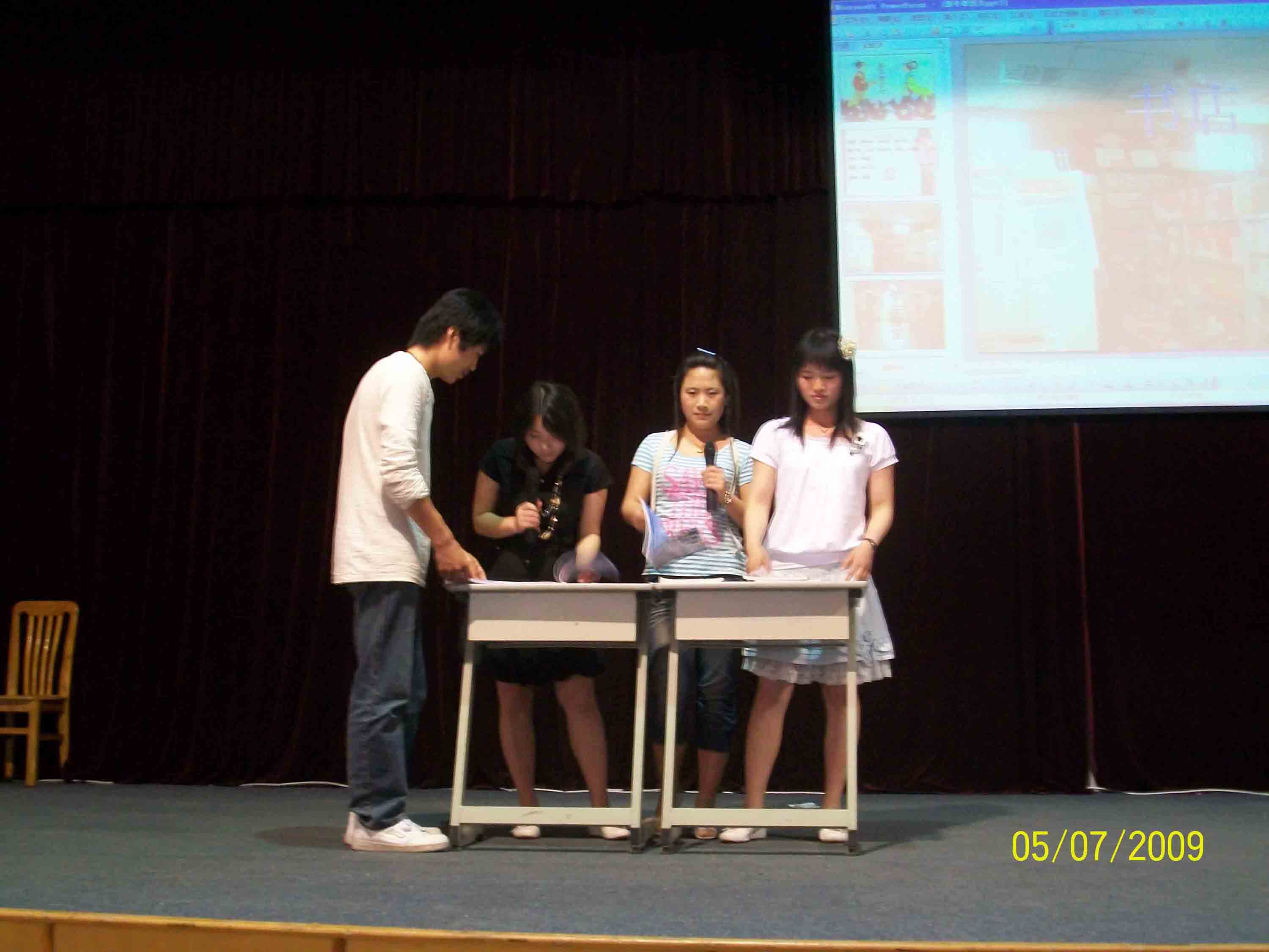 时至夏日,天气炎热,但同学们依然热情洋溢,全体日语专业的同学们齐聚一堂,热闹非凡,场面异常壮观,节目精彩纷呈,令人目不暇接。其中话剧《记忆》以汶川大地震为背景,讲述了一个伟大的母亲在地震时用自己的身体为孩子撑起一片空间,留给孩子生的希望,精深的演技及流畅的口语,给人以美的享受。伟大的母爱深深打动了每位观众,震撼了每个人的心灵。话剧《升达新闻》,以升达校园为剪影,通过记者采访和镜头的不断剪切。来反映当今的某些社会现象。剧中演员诙谐的语气,逼真的表演以及极为流畅的口语迎来台下阵阵掌声,使人在大笑之后不觉沉思。精彩话剧接连不断,给大家带来夏日丰盛的文化盛宴。木村老师的经典演唱又将整个比赛带入了另一个高潮。