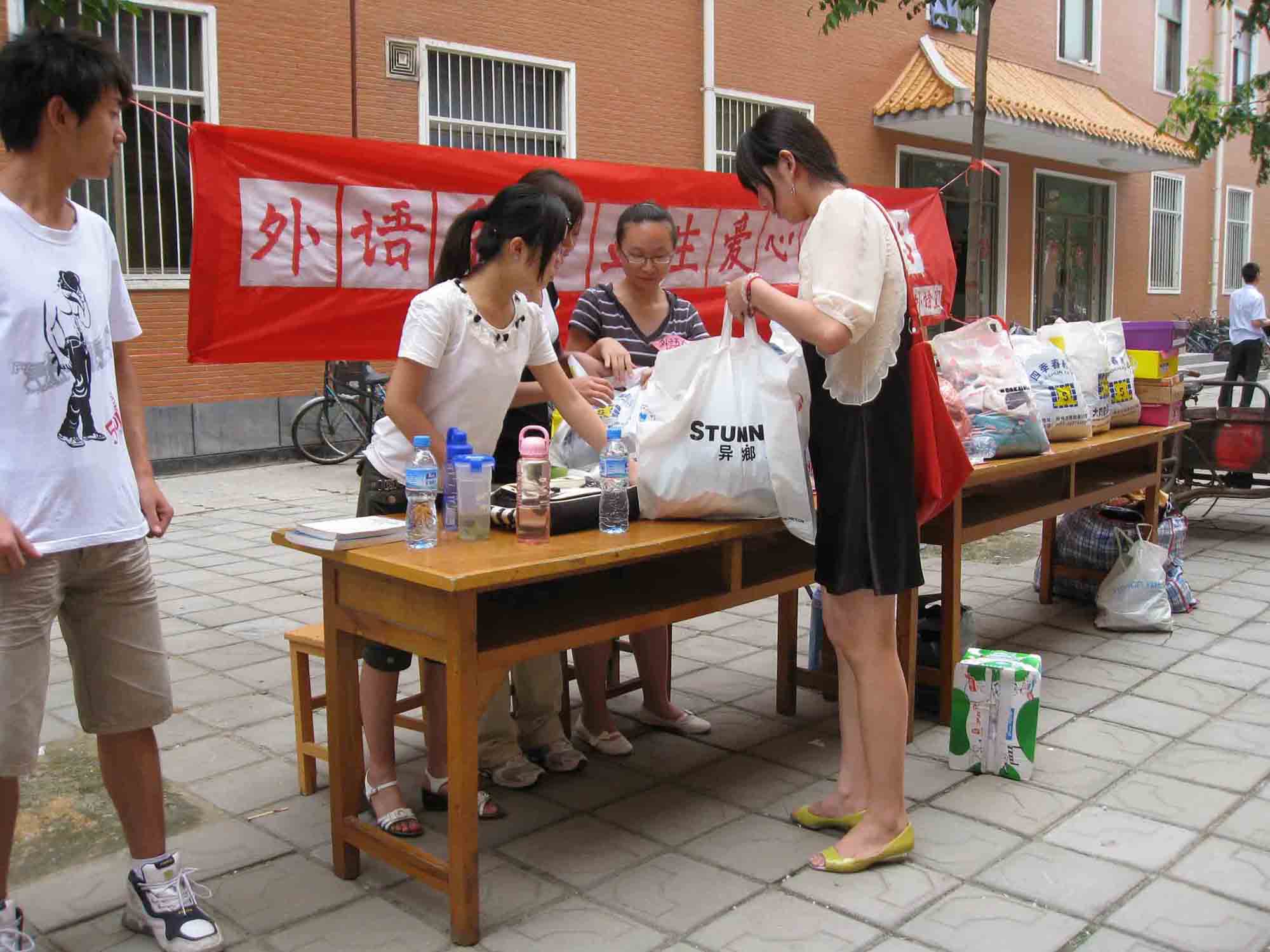 爱心传递活动和送别活动分别同设在宿舍14号楼、16号楼、23号楼前 ,学长学姐们踊跃捐赠,所捐物品多样,不仅有衣服、手包、鞋子、围巾等生活用品,还有教科书、词典、各种杂志等书籍。外语系团学各部门专门组织同学租借三轮车帮助毕业生运送行李。