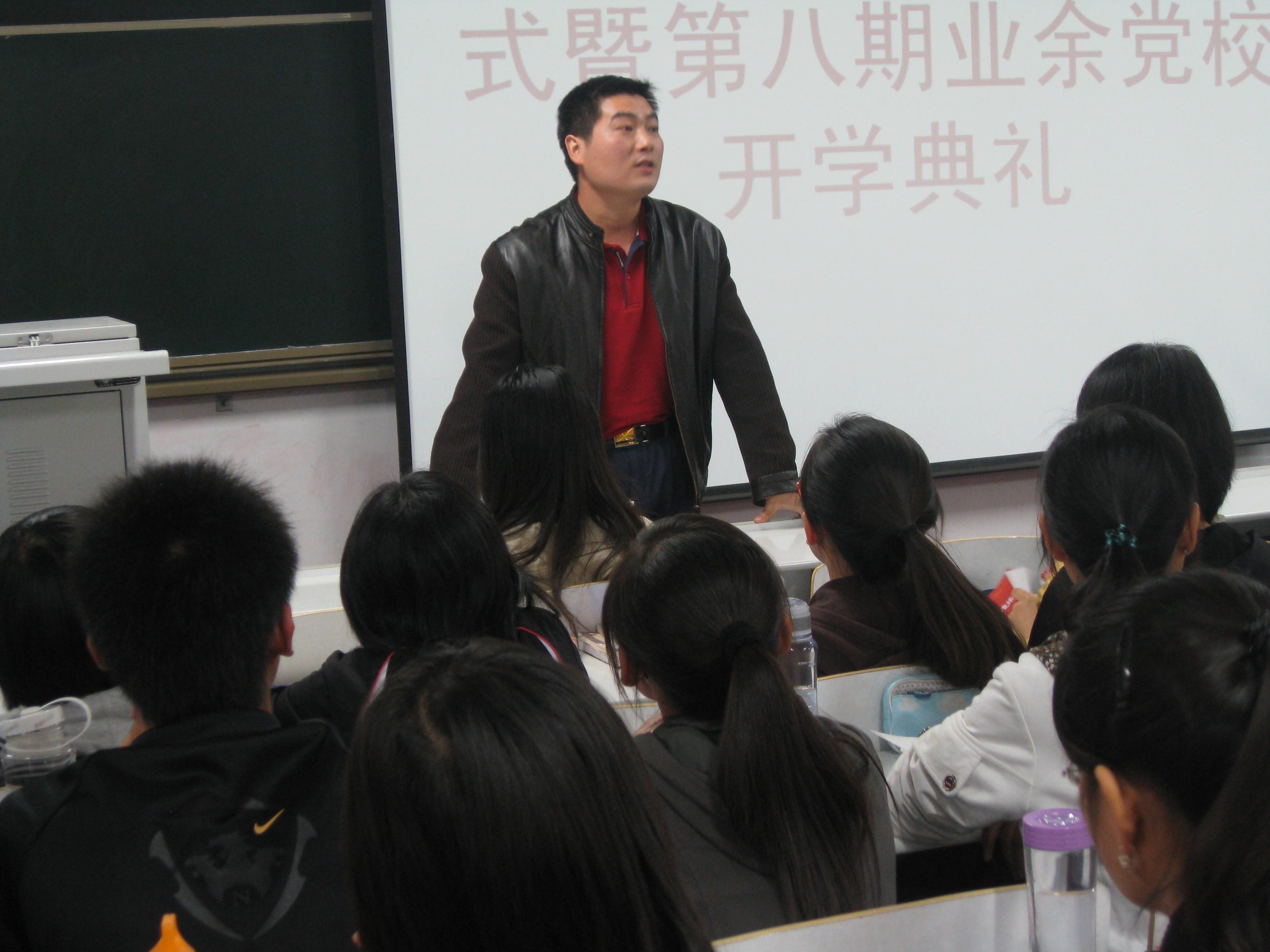 系党总支副书记石皓召老师对新入党同学表示了真挚的祝贺,同时也对第八期业余党校学员提出了殷切的希望。他讲到,入党积极分子在党课学习中,应模范遵守课堂纪律,充分利用学习的机会,深入了解党的性质、指导思想、宗旨等理论知识。同时,在平时的学习、工作、生活中,牢记自己的责任和义务,时时处处做表率,努力成为其他员工学习的典范。此外,石书记还为新学员介绍了一些政治理论学习的方法。