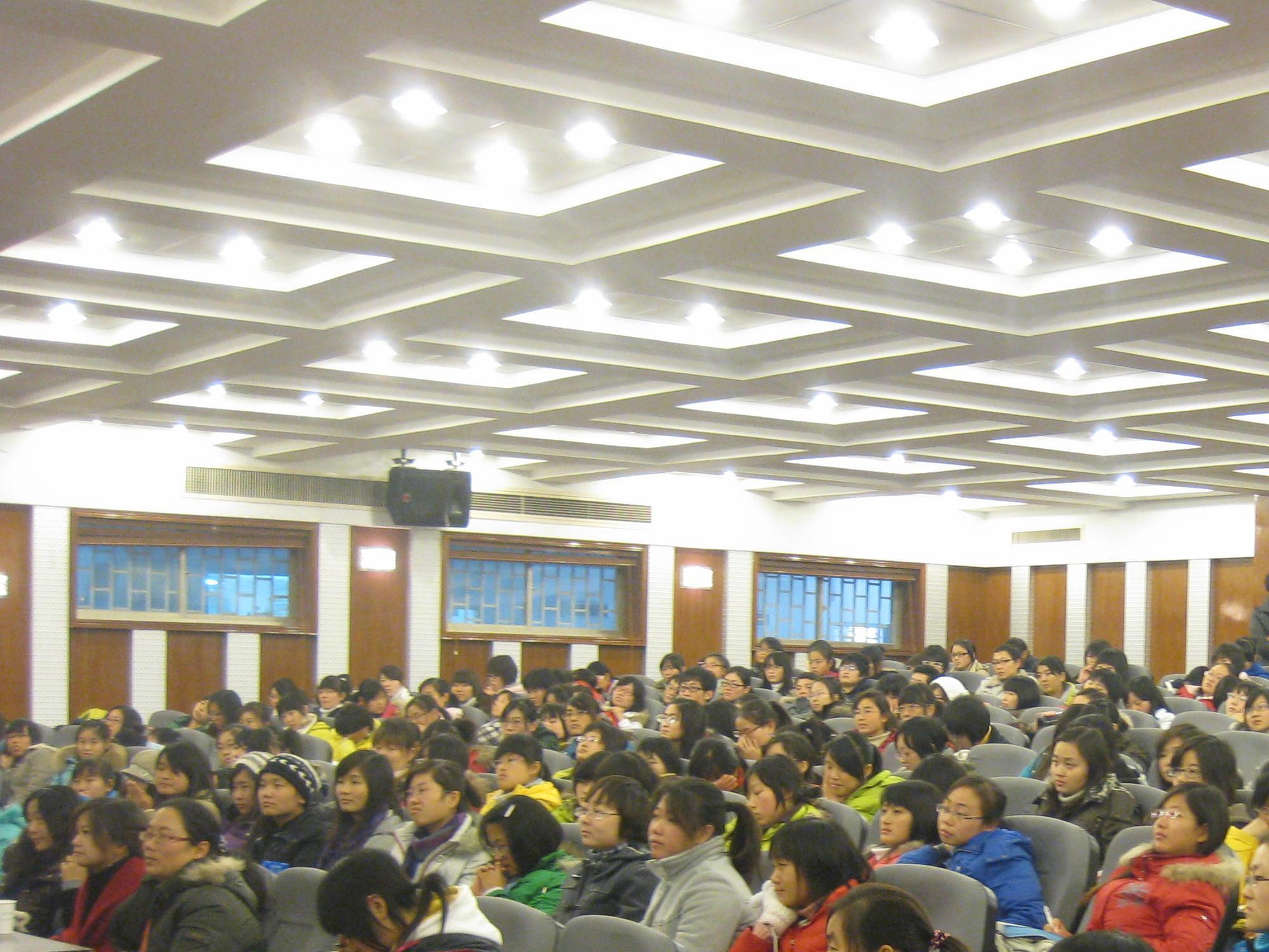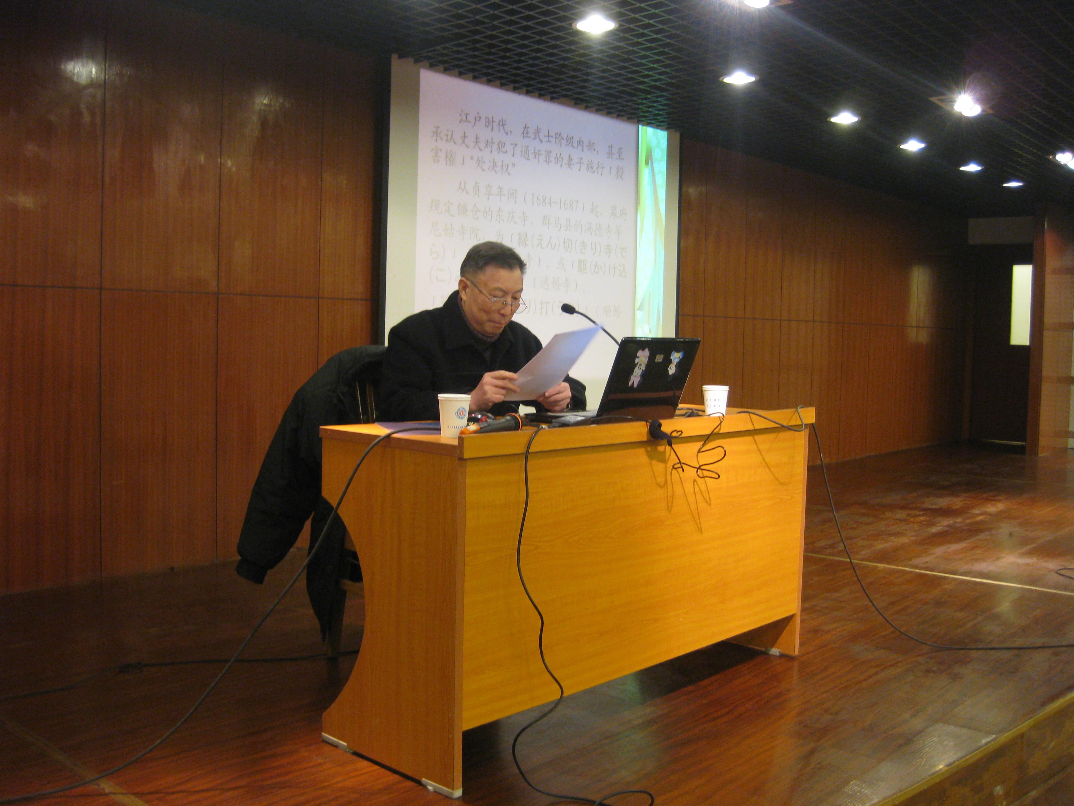刘教授引经据典,大量引用中日文古诗词,详细地阐述了神话时代、访妻婚时代、娶妻婚时代和现在的法律婚时代这四种不同时代日本人的婚恋情况,并对中日女性在历史上的地位进行了对比。一个民族的婚恋史也从侧面反映了它的曲折历史,它是日本历史的缩影。刘教授知识渊博,讲话幽默风趣,他以诙谐的语言把日本婚恋史过程描述得淋漓尽致,报告厅里掌声不断。