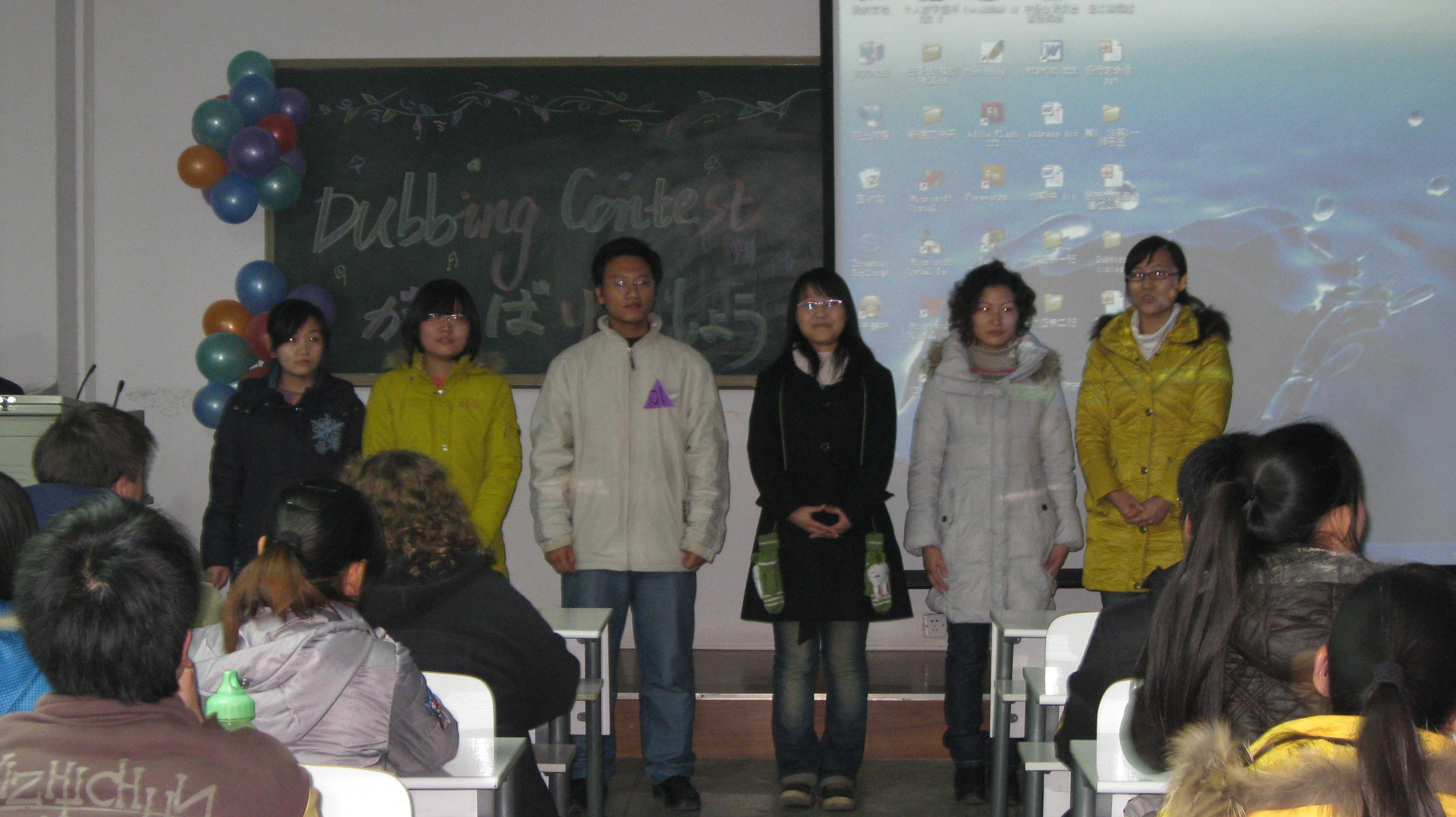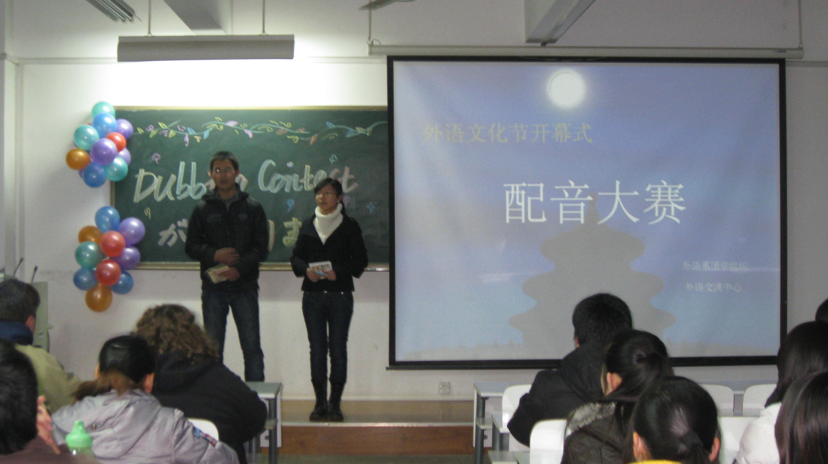 2009年12月17日晚上七点,在资讯楼409教室由外语系外语交流中心举办的首届外文配音大赛如火如荼地开展起来了。到场的嘉宾有院员工会主席季拓,外语系团委副书记付大喜,外语系员工会主席乔羽和副主席王婧等人,据悉,本次配音大赛是第三届外语文化节的开幕表演。