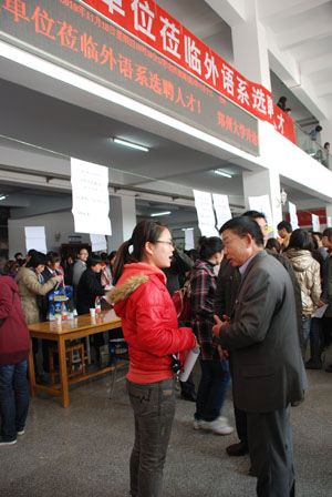 本次招聘会,共有来自省内外37家企业到场招聘,并呈现以下四个特点。一是专业对口性强。在招聘会当天提供的397个岗位当中,对英语专业需求岗位共276个,日语专业需求岗位70个,两个专业岗位的需求量占到了总需求量的87%,充分体现了招聘会的专业性。二是员工单位多。现场有10家用人单位都是委派本单位毕业于升达外语系的员工返回母校招聘。三是成效显著,此次招聘会是我系就业服务月活动的重头戏,在11月份的就业服务月期间,我系共联系就业岗位462个,给2010届毕业生提供了良好的就业平台,据统计,招聘会当天,用人单位共收到了求职简历1328份,另有491名同学进入到了用人单位的复试。四是加强了我系与用人企业的交流与合作。招聘会当天,我系分别与郑州美国优先教育学校、郑州听道外国语培训中心签署了就业实习基地协议,同时与开封维康干冻食品有限公司、郑州联大外国语学校达成了签署就业实习基地的意向。为我系进一步做好毕业生就业工作,打开了新的局面。