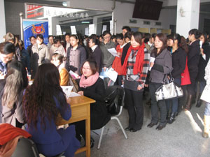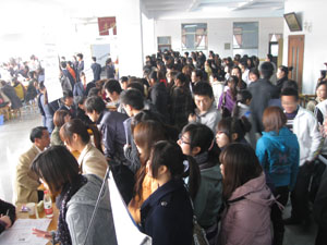 招聘会从上午9点钟开始到下午4点结束,整个会场一直是人声鼎沸、热闹非凡。在每个单位的招聘摊位前,同学们都自觉地排起了一列列长龙,充分展示了我系员工的良好修养和精神面貌,许多同学都充满自信地接受了单位负责人的初步面试。本次专场招聘会是外语系全面贯彻落实学院全心全意做好毕业生就业服务工作的具体举措之一,同时也是外语系首次举办这种大规模的专场招聘会。为举办好本次招聘会,外语系多次召开专题会议,研究部署相关工作。一是发动全体教职员工,通过各种渠道,广泛联系企业来我系开展招聘活动。二是制定详实的招聘会方案,立足服务好企业、服务好员工,达到用人企业和毕业生的双满意。三是对每一家参会的企业,我们都实行二对一的全程跟踪服务,即每一家企业都有两名员工会同学全天陪同服务,随时解决用人企业所遇到的难题。会场内还设立了专门的服务台,为招聘企业提供良好的服务。