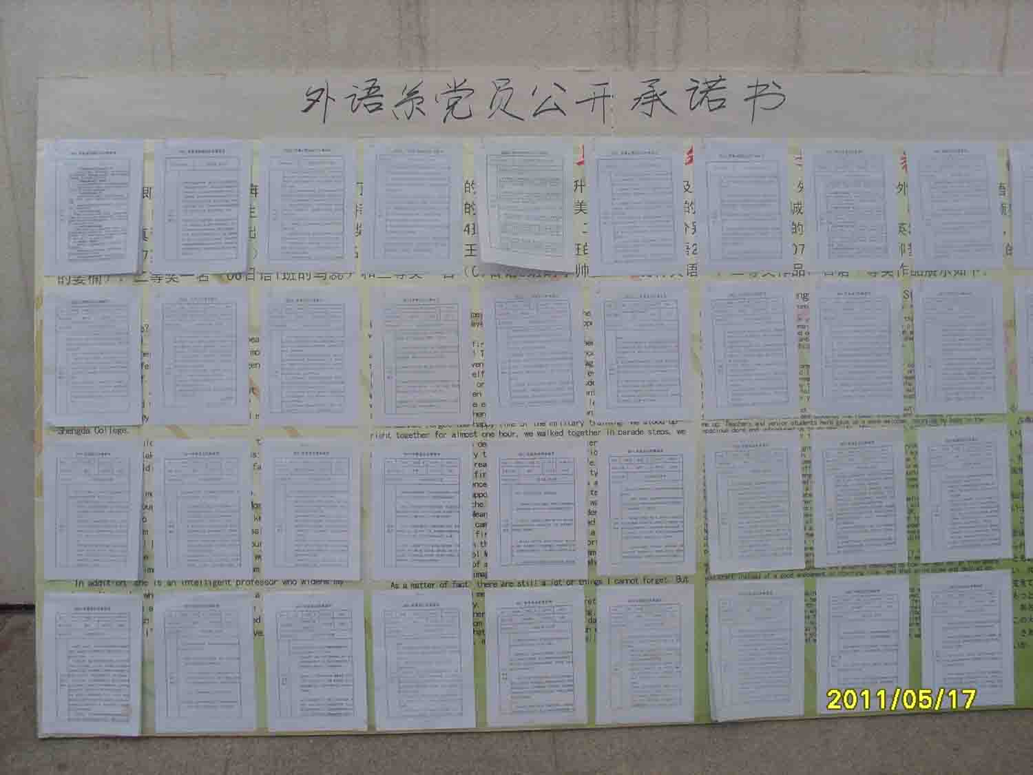 外语系党总支及各支部对照“创先争优”活动“五个好”基层党组织的标准要求,结合实际情况,深入群众,科学调研,围绕党支部建设,充分发挥党支部的战斗堡垒作用和党员的先锋模范作用,加强党员队伍教育和管理,加强党员与群众的密切联系,发挥党员在教学、科研、管理中的骨干作用等方面作出承诺。全体师生党员以刻苦学习、努力工作、廉洁自律、服务师生为目标,结合自身实际作出了公开承诺。