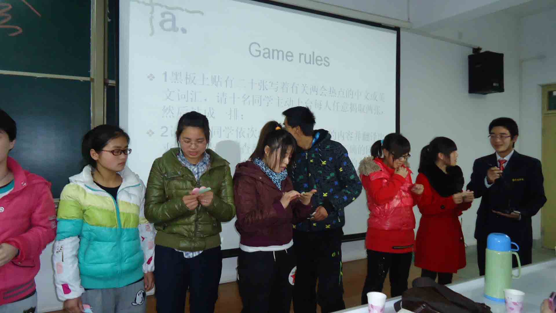交流会首先播放了两会热点问题、国家领导人重要讲话等视频,让大家对两会有了更进一步的了解和认识。随后进行的两会热点词汇、语句的有奖翻译小游戏,有效地活跃了现场氛围,寓教于乐,有效的提高了大家学习两会的积极性和主动性。同时,大家各抒己见,针对今年两会的热点民生问题展开讨论,在讨论中更深层次的领会了两会的内涵,也认识到了自己身上的责任。