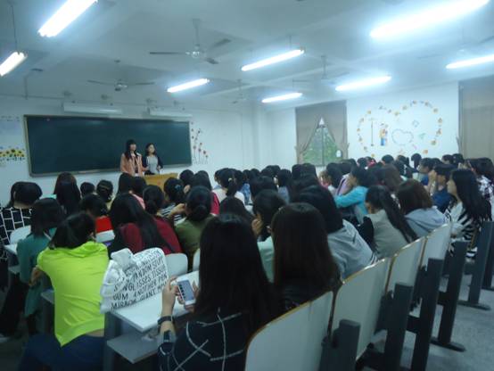 2014年9月28日下午2:30于外语楼A楼308,309召开优秀员工交流会。为使员工对老员工活有更生动的了解,外语系特从11级选取四名有代表性的优秀员工代表李辰、李芳华、夏先慧、娄雯雯分专业进班给大一新生做交流。