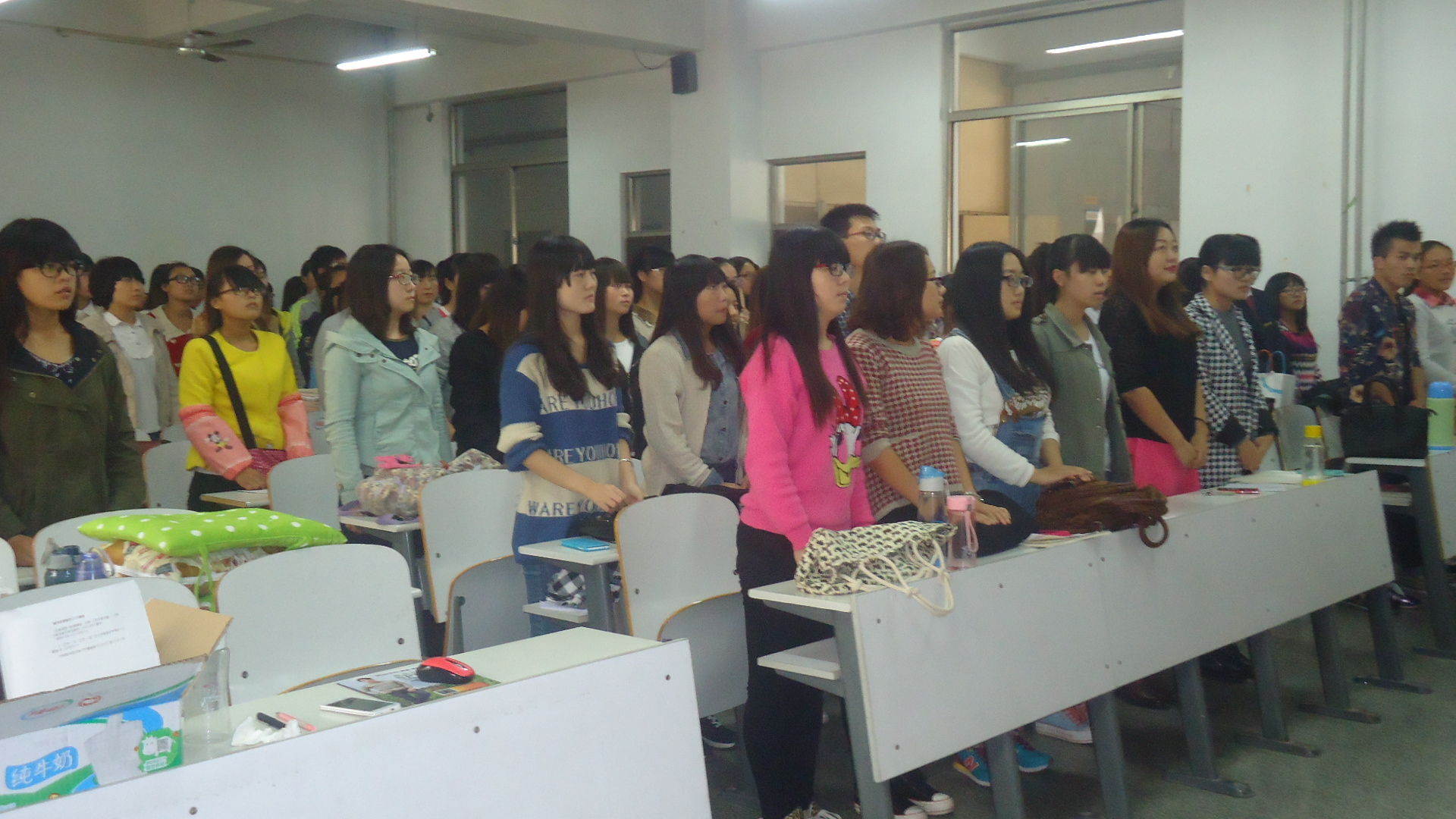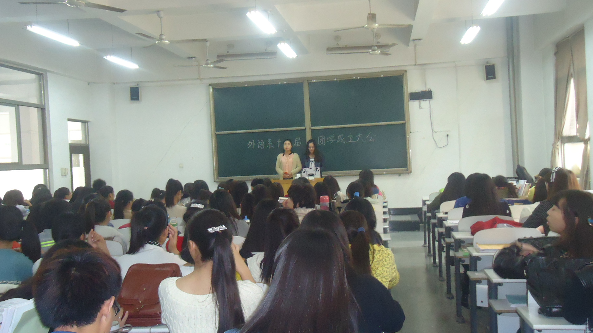 紧张的招新活动结束后,外语系全体成员于2014年10月17日中午一点二十在外语楼A座101室召开第十九届团学成立大会。外语系团委副书记王娟老师,员工会主席刘倩倩,团委副书记师欣,程聪,员工会副主席张鹏飞,张艾出席此次会议。为团学开启新篇章。