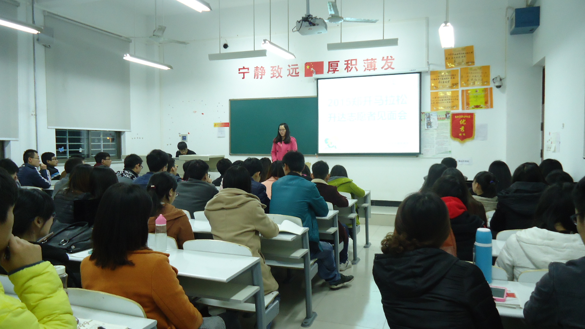 3月18日晚,在时金楼111由外语系青志协主办的郑开马拉松志愿者见面会拉开帷幕,通过海选、复试和面试的层层选拔,76名来自全院各系各专业的同学成为本次郑开国际马拉松比赛升达站的志愿者。