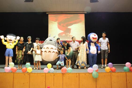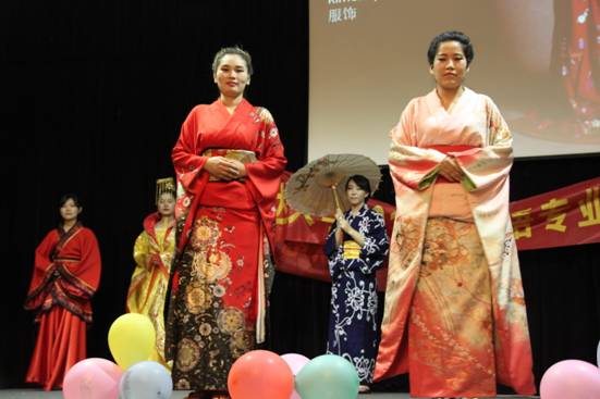 晚会由动漫人偶龙猫、机器猫、大熊的出场中拉开序幕。5位主持人用地道动听的日语宣布了晚会正式开始。随后精彩纷呈的节目依次揭开了神秘的面纱。大三同学表演的服装秀华丽登场,日本和服展示更是展示了日语专业的特色,让大家领略到了日本文化的魅力。大二的全体同学的走秀,展示了我在校生的良好精神面貌。毕业生王淼榕带来的歌曲《出发的日子》,歌词中体现了毕业生们对母校依依不舍的感情,歌声中体现了毕业生进入社会的信心,将晚会推向了高潮。毕业生代表暴欢欢和苏莹莹同学登上舞台,介绍了他们的就业情况,据他们讲日语专业就业形势很好,进一步增强了日语专业在校生的信心,同时还给在校生们提出了学习上的一些建议。