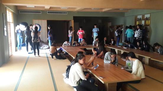 首先,张峰老师和洪艳荣老师带领新生们到外语楼的日本文化室参观。新生们一进入日本文化室,就发出阵阵惊叹声,洪艳荣老师生动有趣的讲解更引发员工们不断提问。讲解之后,留出了10分钟的时间给大家体验日本文化,员工们相互照相、试穿动漫服饰、翻阅日语书籍等,兴奋之情一直持续到返回主教室。