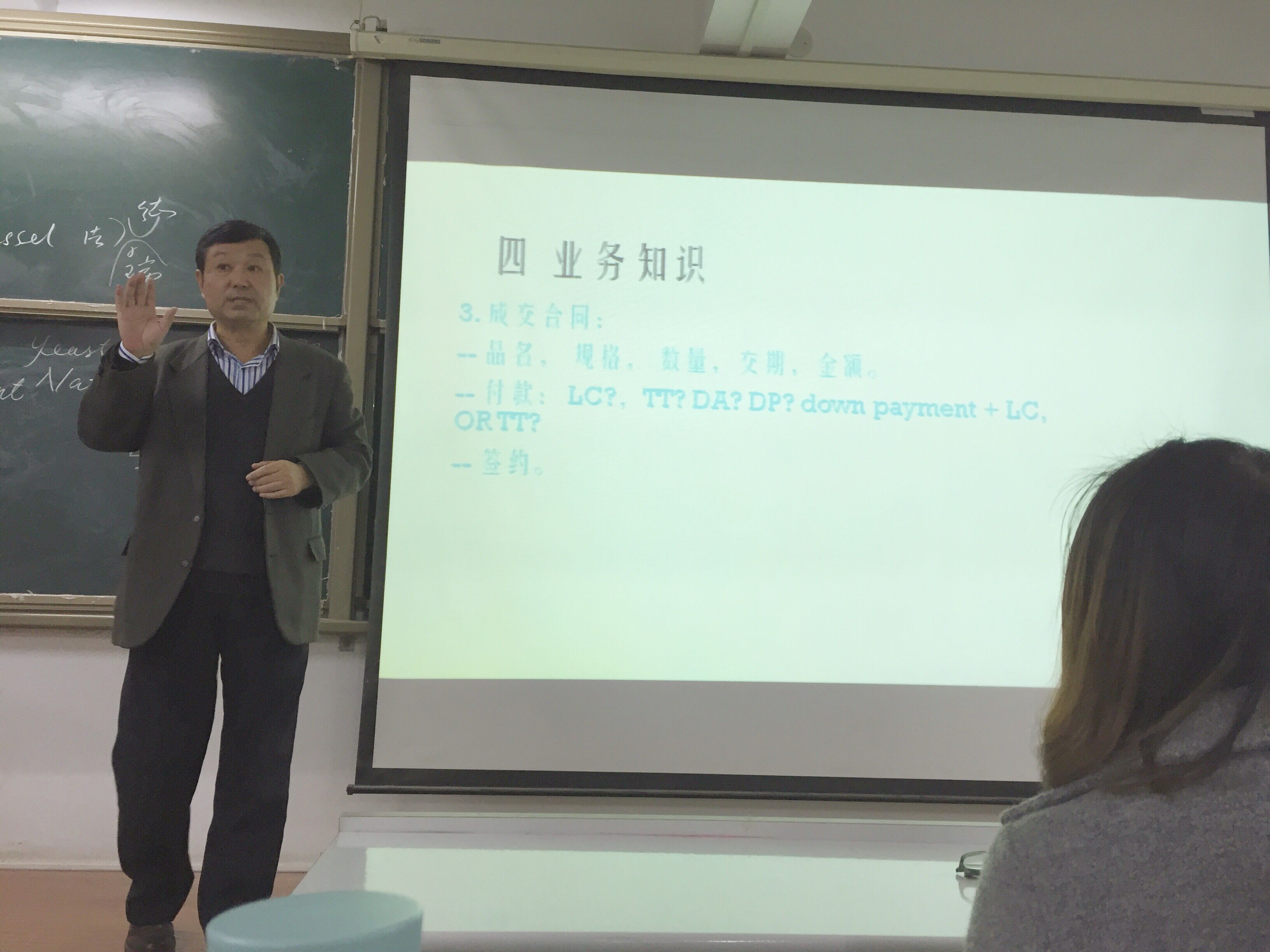 随后,尚金生经理强调要从事外贸工作,还要有贸易相关的背景知识,比如世界地理(中国对外贸易主要市场的分布)、海运线、主要港口、集装箱规格等。最后,他从寻找商机、确定合适的货源、合同成交、合同的执行、租船订舱、准备议付文件或交单文件、交单和售后服务8个方面,为大家呈现了整个外贸业务工作的基本流程,这也正是从事外贸工作应具备的业务知识。