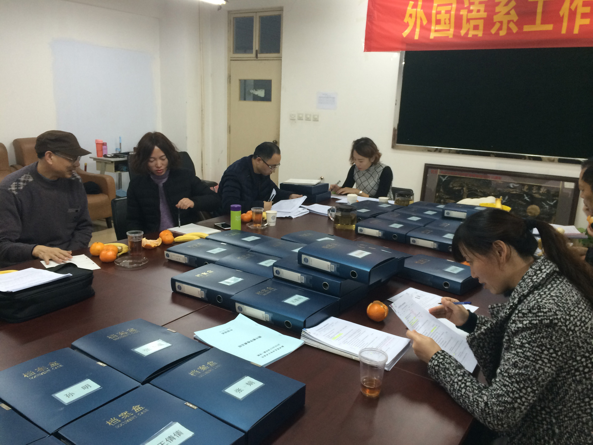 首先张主任向吴教务长介绍了本学期外语系的教学运行情况、教学改革系列措施、迎评促建等工作。吴教务长对我系的相关工作非常关心并针对性提出很中肯的意见建议。随后督导组叶教授、其他几位检查的老师同时对我系本次期中教学检查展示的37位专职教师的教检材料、四个教研室的小结、我系的教学检查总结、本学期我系听课记录和部分2017届毕业论文开题报告进行了认真详细的检查,几位专家领导都对我系在本次期中教学检查中的做法进行了肯定,特别表扬了我系教师的互查总结,最后几位教授还总结:我系的典型事例突出,每位老师的互查小结信息丰富、详尽;老师的教检材料齐全,对教师材料的评定呈正态分布。
