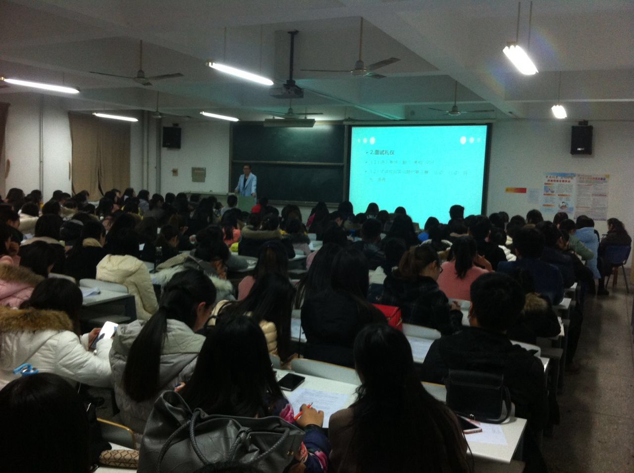 今年外语系教团队格证考试取得可喜成绩,据统计外语系共有117人通过了教团队格证16年度的笔试。教团队格证面试将于元旦后第一周周末进行,为帮助广老员工顺利通过面试,外语系积极联系多方资源,为广大参加教团队格证面试的员工组织了两场辅导讲座,取得良好效果。第一场邀请社会上的培训专家为各系参加面试员工做了一场《教团队格证改革后的面试技巧》的讲座,介绍总体的面试流程,评分标准,注意事项备考技巧等。200人的多媒体教室座无虚席,很多同学都是站着听完讲座。第二场外语系鲁东教授就英语学科面试技巧进行了专题讲座,并邀请去年通过面试的同学现场演示。教室早早被挤满,很多同学站着听完讲座。