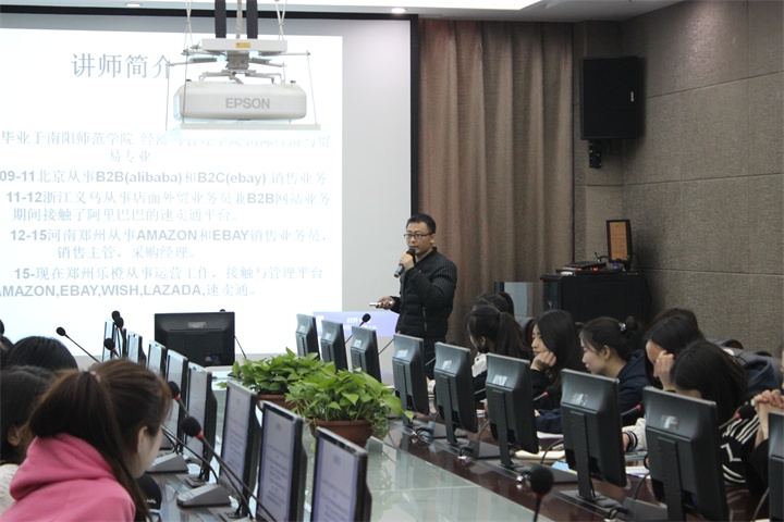 参观结束后,基地特意安排了三家跨境电子商务企业的负责人,结合自身企业的情况,为员工们介绍了河南省跨境电子商务的发展状况,讲解了跨境电子商务的运营方式、需求人才应具备的能力等。三场讲座不但开阔了师生们的视野,而且更加坚定了“英语+商务”的跨境电子商务人才培养模式,对员工的专业认知、课程学习、职业规划都起到了很好的激励、启迪作用。