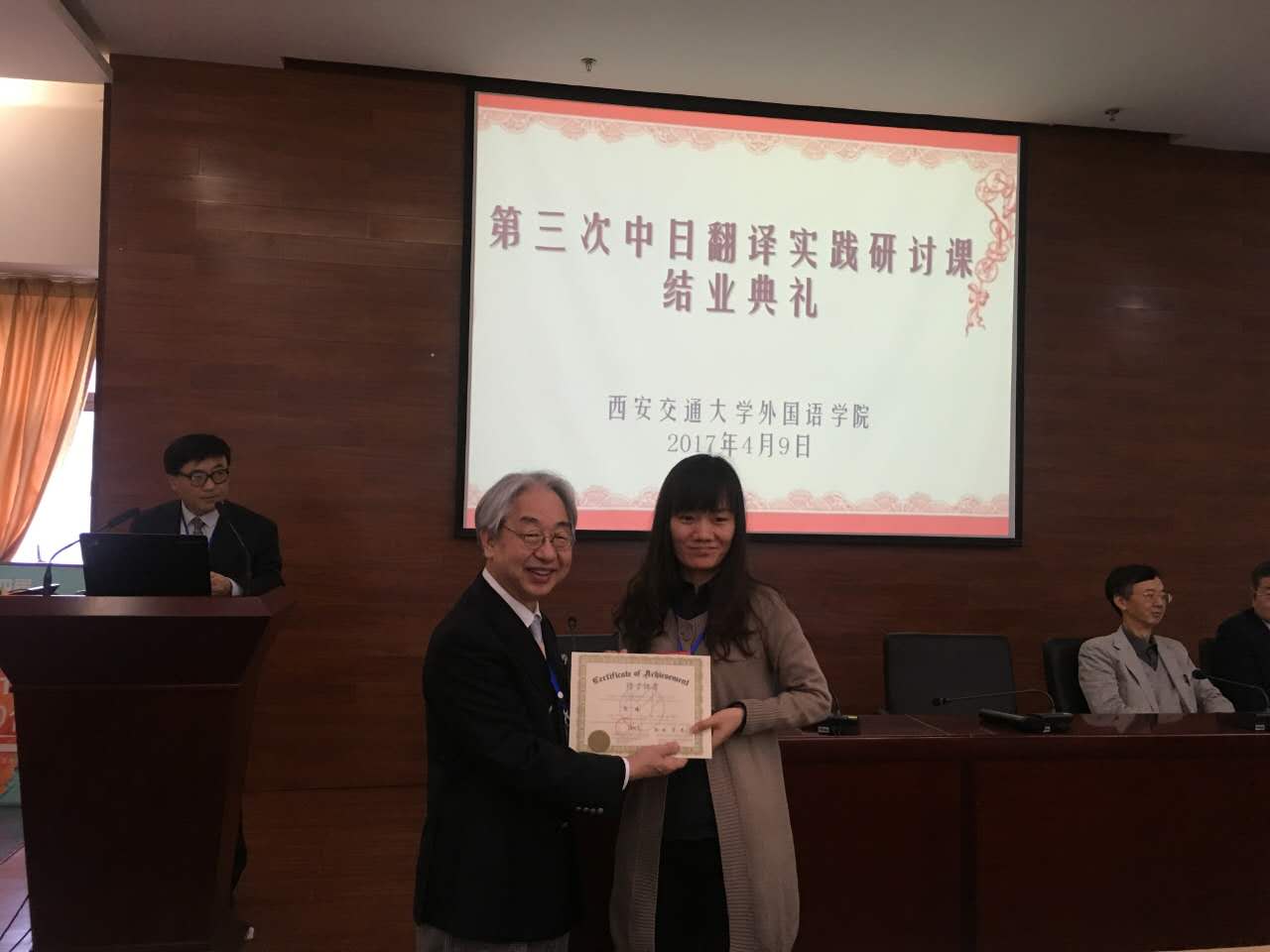 最后,全体学员及讲课专家出席了第三次中日翻译实践研讨课的结业典礼。松冈荣志教授和西安交通大学太阳成集团tyc33455cc日语系副主任曹红荃副教授共同为参加学习的28位学员颁发了结业证书。