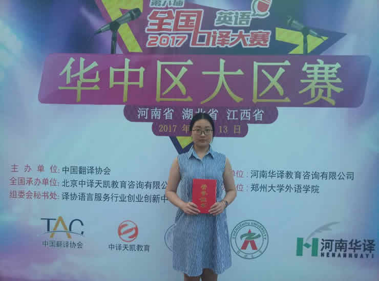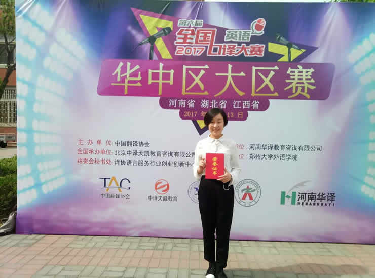 公司代表队经过河南省赛区的洗礼,尚璐莉、鹿英在河南赛区脱颖而出,进入到华中区的大区决赛。参加此次大区赛的选手来自华中三省(河南、湖北、江西)各大高校,其中不乏武汉大学,华中科技大学等重点大学的参赛选手。比赛过程精彩纷呈,竞争十分激烈。比赛分为淘汰赛和排位赛两个阶段,赛题较复赛更是增加了难度,非常考验员工的口译功底。比赛环节的设置对参赛选手在语言转换能力、信息处理能力和现场应变能力、知识储备等方面具有很大的挑战性。公司代表队的尚璐莉同学,先是在淘汰赛中脱颖而出,进入到排位赛。在排位赛中,尚璐莉趁着冷静,不畏强手,依靠过硬的实力和精彩的表现,最终获得三等奖,为学院和系里争得了荣誉。