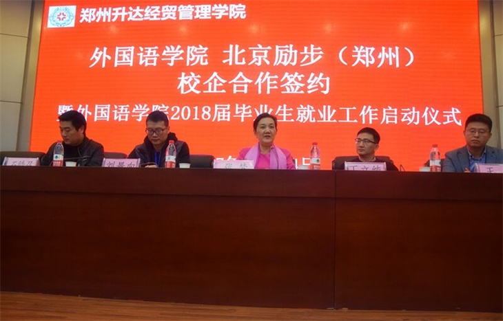 10月24日下午,外语学院与北京励步英语校企合作签约暨外语学院2018届毕业生就业工作启动仪式在国际会议厅顺利举行。学院人才招聘处刘景向处长、外语学院经理张梦教授、公司党总支书记石皓召同志、北京励步英语全国运营总监丁立纯先生、北京励步英语郑州区运营总监王化先生,以及外语学院2018届毕业生参加了此次活动。