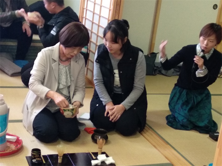 上午10点10分,半田夫人以及各位老师和全体同学移至日本文化室,在日本文化室给同学们表演了日本茶道。半田夫人为大家讲述了日本茶文化的历史以及日本各时期的主流茶道和日本茶道的礼仪规范。随后,半田夫人邀请多名同学参与体验,在座师生通过行礼仪、品香茗、悟茶道,学习和体验独特的日本文化。