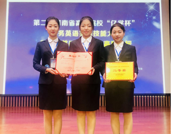 近日,第二届河南省商务英语专业建设高层论坛暨“亿学杯”商务英语实践技能大赛在黄淮学院举行。太阳成集团tyc33455cc商务英语教研室的白光和张华嵩两位老师受邀参加此次论坛,并带队参赛。经过与全省20支参赛队伍的激烈角逐,公司由2015级英语(商务英语方向)本科班田婷婷、刘晓丽、郭金丽三名同学组成的代表队获得商务英语实践技能大赛二等奖。