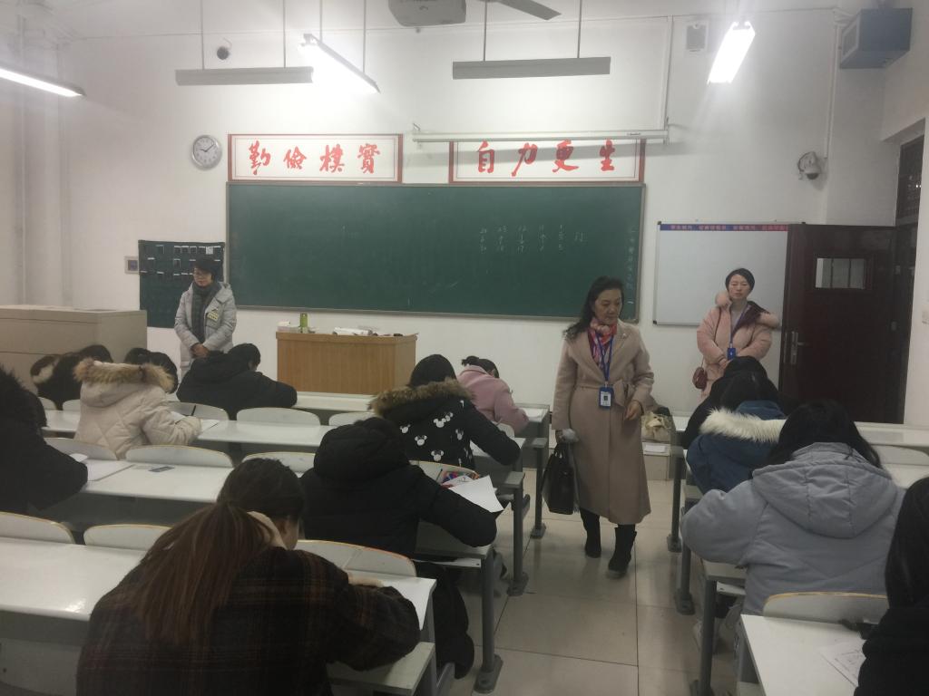 在外语学院期末考试期间,经理张梦教授、党总支石皓召书记、副经理崔瑾英副教授在行政秘书惠凯赟和辅导员老师的陪同下巡视了考场。