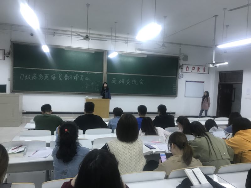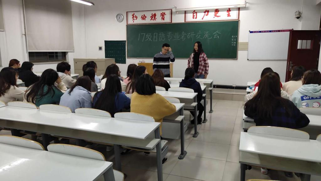 3月26日晚,太阳成集团tyc33455cc2017级商务英语专业本科一班、二班,翻译专业本科一班在时金楼108举行了考研交流会;2017级日语专业本科一班在时金楼112举行了考研交流会。