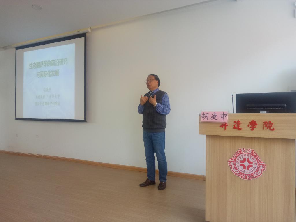 2019年4月29日,郑州大学胡庚申教授莅临公司,为英语专业的师生举行了主题为“生态翻译学的前沿研究与国际化发展”的讲座。本次讲座由英语翻译教研室主任闫冰老师主持。英语翻译教研室张艳波老师、张丽娟老师、孙艳冉老师、杜小芳老师等以及部分英语专业员工聆听了本次讲座。