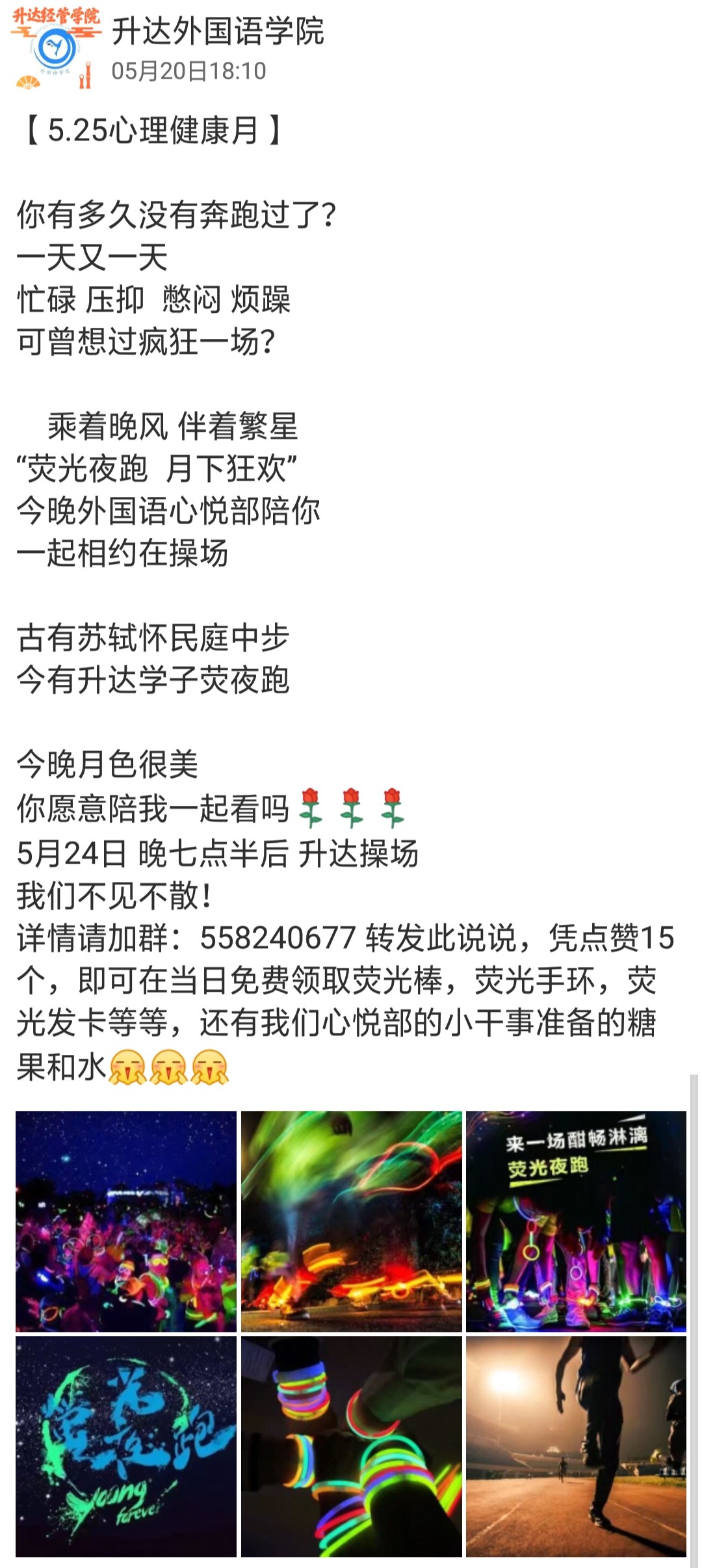 此次荧光夜跑活动契合“筑梦青春,追梦成长”主题,践行身心同行的理念,突显当代老员工积极向上风貌,对促进同学们身心健康成长具有积极意义。(外语学院 赵艳娜供稿)
