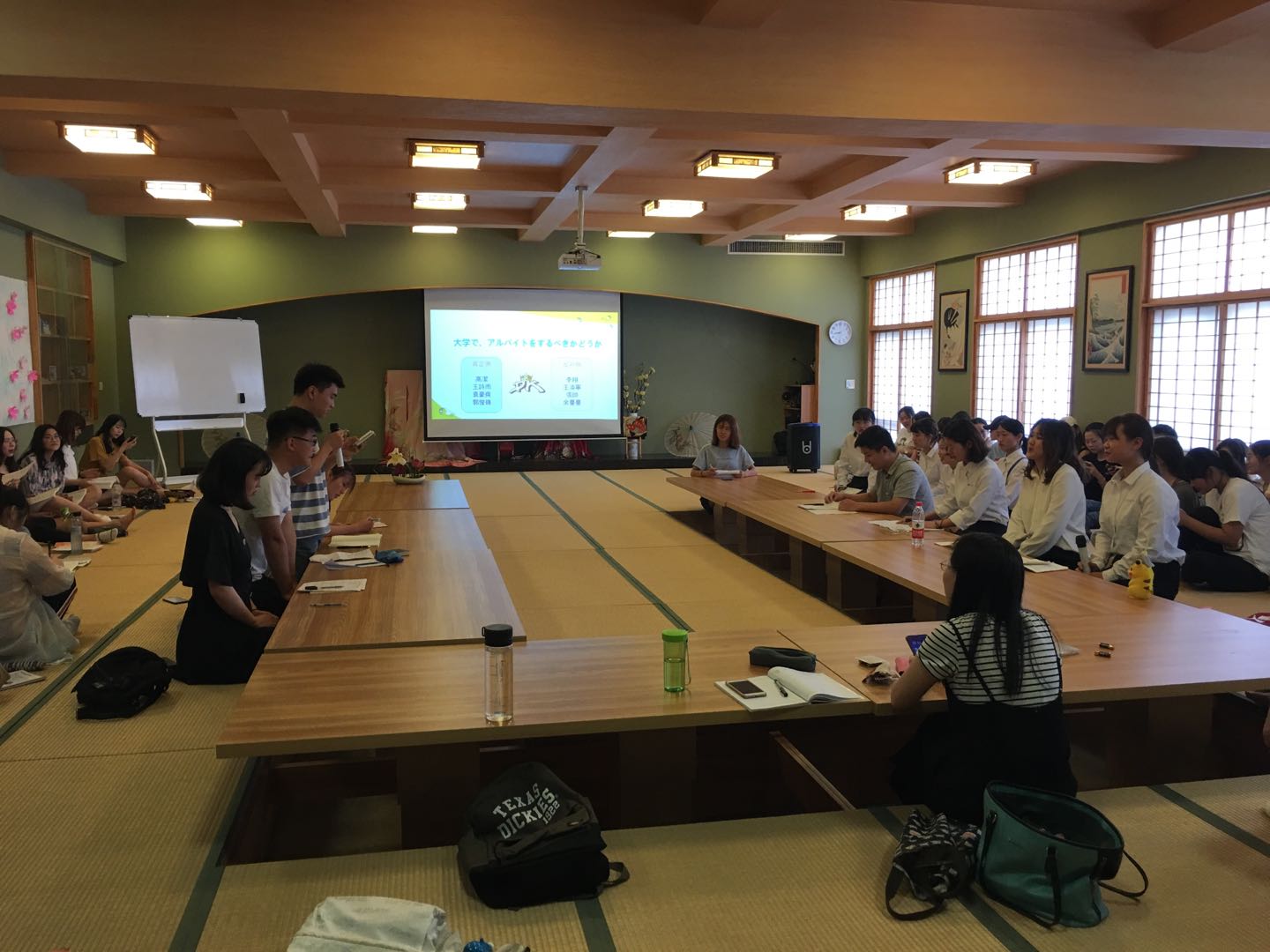 辩论赛有幸邀请到了18级的两位基础日语老师张峰老师和洪艳荣老师担任评委,公司辩论队的优秀队员申薇同学担任主席。本次辩论赛由四组辩论队围绕“大学期间应不应该打工”和“毕业之后在大城市工作好还是在中小城市工作好”两个论题进行辩论。