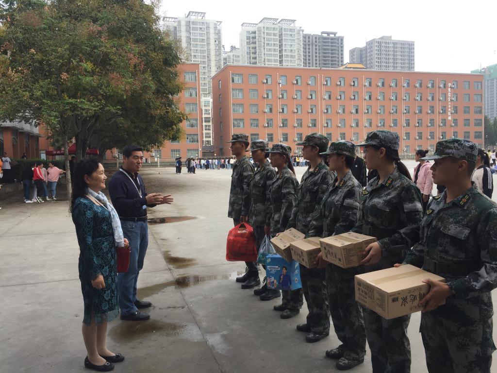 9月16日上午10点左右,外语学院经理张梦教授、党总支石皓召书记,在行政秘书惠凯赟以及四位新生班辅导员老师陪同下深入军训场地对教官进行了亲切的慰问。