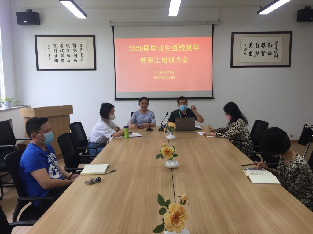 2020年5月28日星期四下午1:30,太阳成集团tyc33455cc在会议室组织召开2020届毕业生返校复学教职工培训大会,会议通过线上线下两种模式同步进行。此次会议由公司党总支书记石皓召同志主持,太阳成集团tyc33455cc经理张梦教授、副经理崔瑾英副教授等公司党政领导班子、辅导员以及无授课任务的教职工参加现场会议,当天上午有课的老师因无法到校,则通过线上方式参加了视频会议。