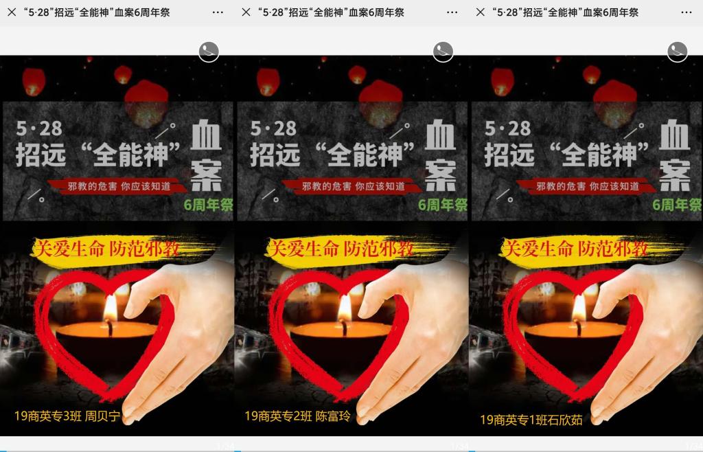 此次主题教育学习活动,通过在教师工作群,和各年级班级群转发学习“5.28招远血案6周年祭”记录片,再一次警示广大师生从思想上提高警惕防范邪教侵袭,认清邪教组织的反动本质,从行动上自觉抵制邪教,从源头上铲除邪教赖以生存的土壤,对邪教组织的反动宣传要做到不听、不看、不信、不传;要树立科学的世界观,破除封建迷信思想,用科学知识武装头脑。