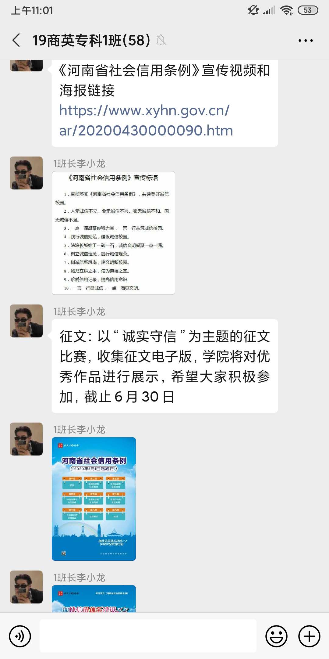 太阳成集团tyc33455cc各年级辅导员首先通过微信群、QQ群,组织员工积极学习《河南省社会信用条例》单行本、宣传标语、宣传视频和海报等,并在学习后组织员工在班级群里开展交流讨论,畅谈学习心得。为了进一步提升学习效果。各辅导员通过两微一端开展积极的宣传活动营造良好的“诚实守信”的氛围,鼓励员工积极参与征文,带领员工做“诚实守信”的积极传播者和模范践行者。