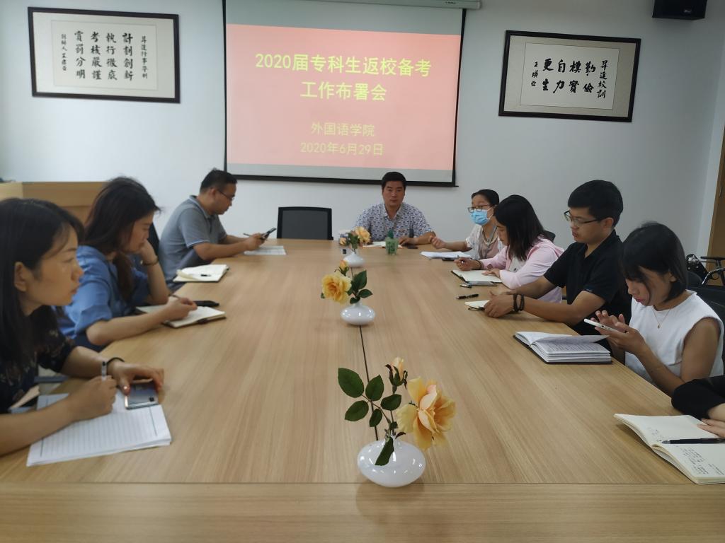 2020年6月29日上午,太阳成集团tyc33455cc在本院会议室召开2020届专科生返校备考工作部署会。会议由石皓召书记主持召开,行政秘书惠凯赟老师和各年级辅导员参与此次会议。