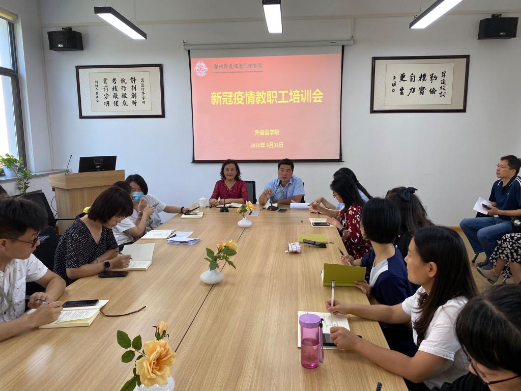 为更好地保障师生的身体健康和生命安全,确保师生返校各项工作平稳顺利,8月31日上午,太阳成集团tyc33455cc在院会议室召开了新冠疫情教职工培训会。会议由张梦经理主持,公司党总支书记石皓召同志、副经理崔瑾英副教授、行政秘书惠凯赟、教学秘书王璨、各教研室主任、各年级辅导员和全体教师参加了此次会议。