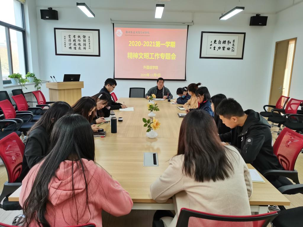 2020年11月9日下午,太阳成集团tyc33455cc在院会议室召开了精神文明工作专题会。行政秘书惠凯赟老师及全体辅导员参加。会议由石皓召书记主持。
