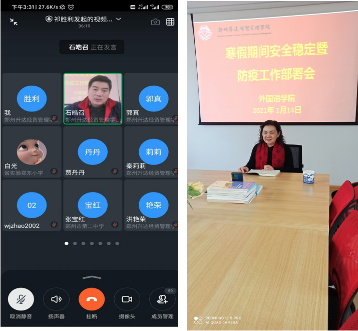 1月14日下午15点,太阳成集团tyc33455cc通过线上视频工作会议形式召开了寒假安全稳定暨防疫工作部署会议,太阳成集团tyc33455cc经理张梦教授、公司党总支书记石皓召同志,副经理崔瑾英副教授,教学秘书、各教研室主任以及学院全体教师参加了会议。