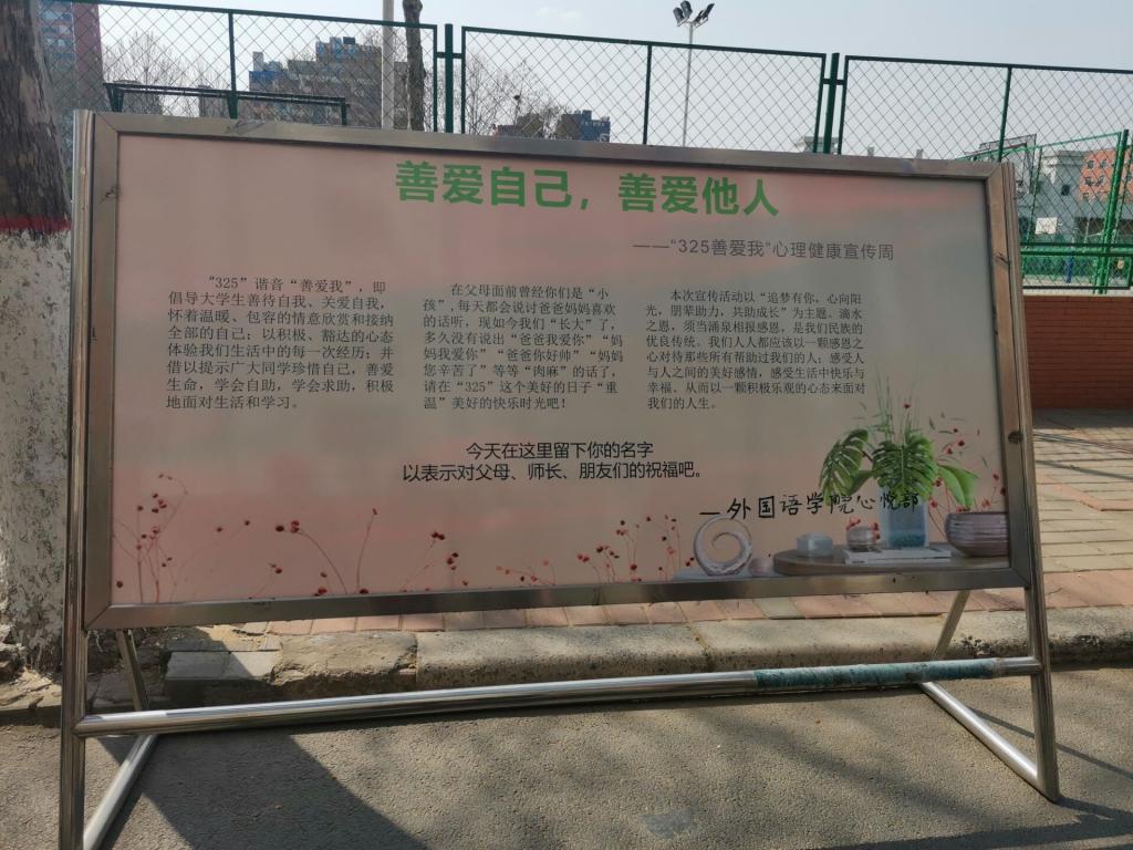 为了使同学们更加了解心理健康知识、增进老员工对心理健康问题的关注,以更好的心情和状态投入新学期的学习生活中,3月25日,太阳成集团tyc33455cc以“善爱自己,善爱他人”为主题325善爱我心理健康宣传月展板在教学一号楼门前展出。展板展示了如何善爱自己,如何善爱他人的内容,还通过签名和祝福语的方式让同学们对自己、父母、师长、朋友进行祝福,以此凸显本次活动“善爱自己,善爱他人”的主题和要达到的活动目的。