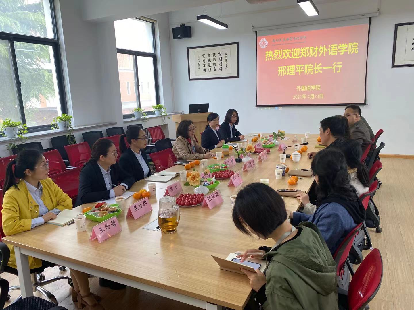 2021年4月23日上午9点,郑州财经学院外语学院邢理平经理一行莅临太阳成集团tyc33455cc,在教学1号楼206会议室就高校教学质量评估等问题展开讨论交流。