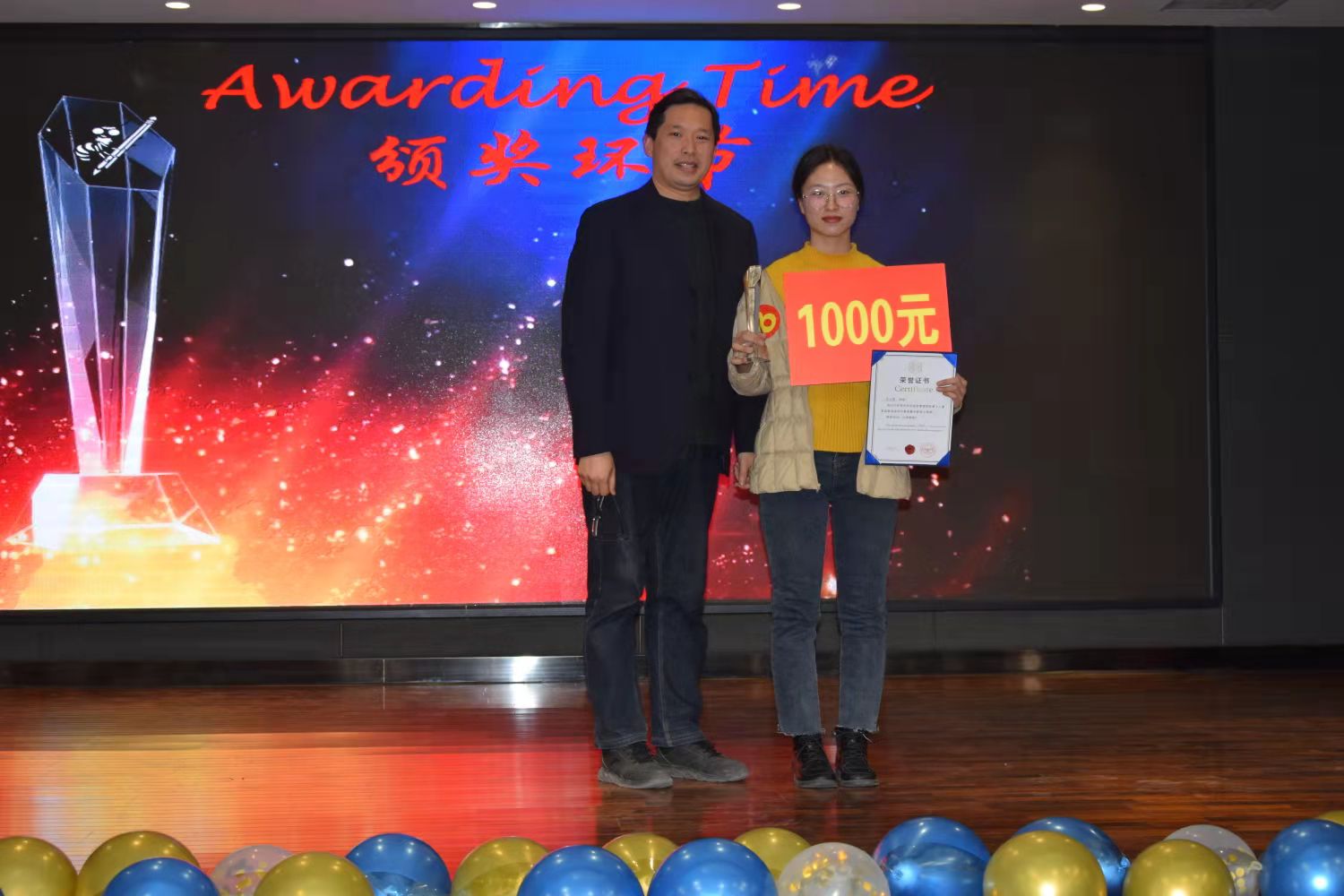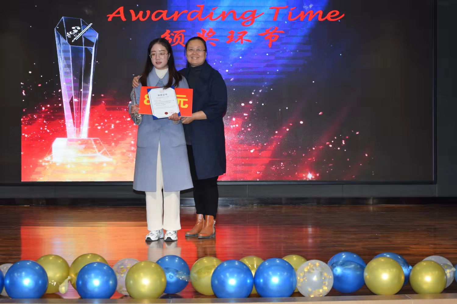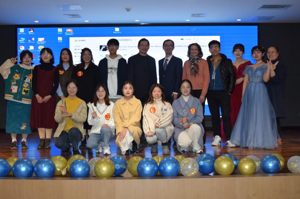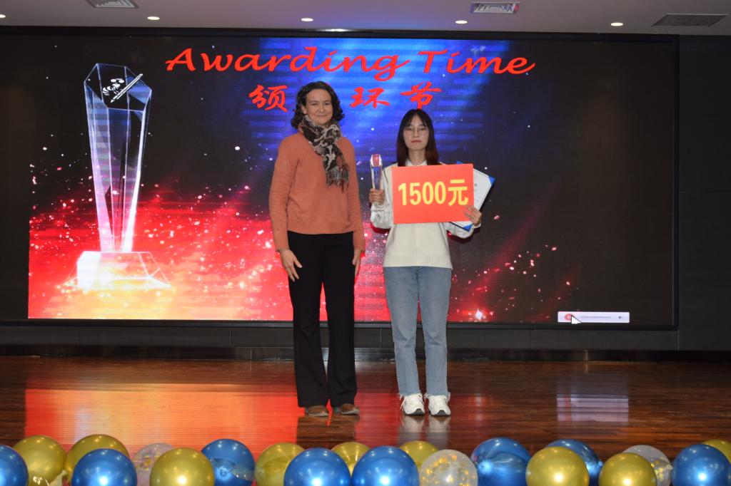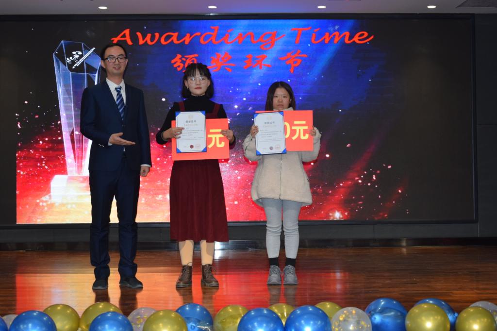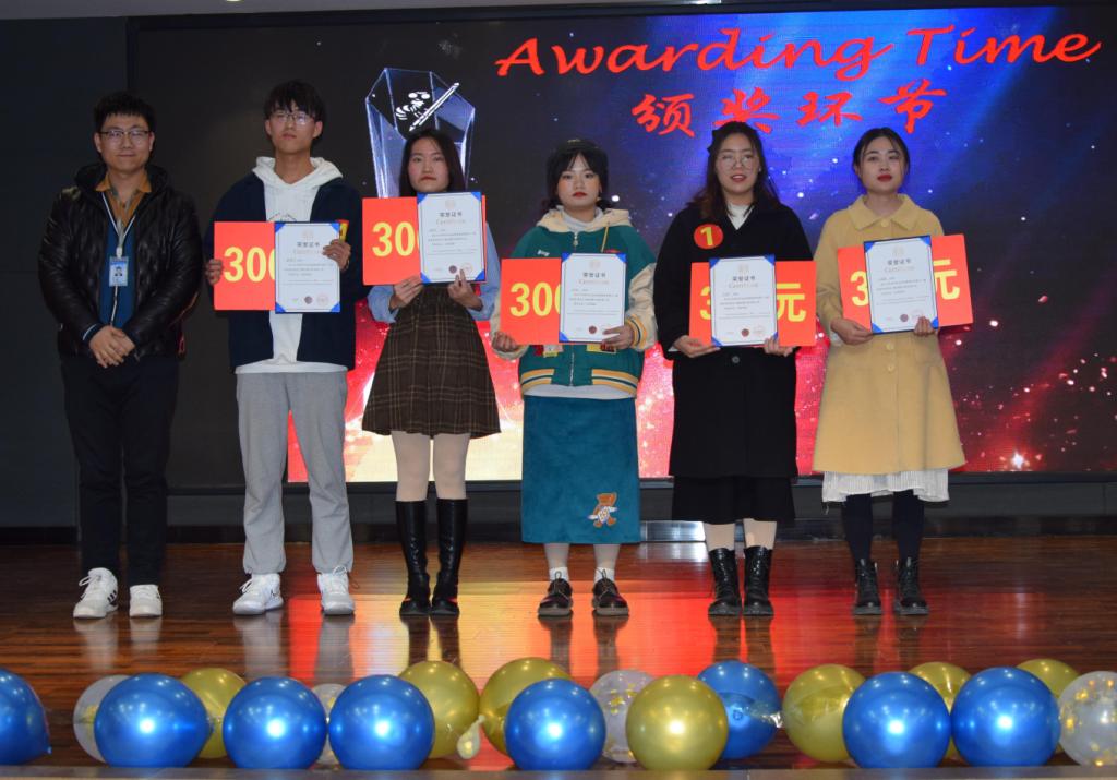 经过近两个小时的比拼,18英本二班张兰兰同学折取桂冠(奖杯+1500元奖金),18商英本三班李冰雪同学获得第二名(奖杯+1000元奖金),第三名为18英本四班李怡帆(奖杯+800元奖金)。第四名、第五名分别是18英本一班赵利冰和18商英本一班时溢满,每人获得600元奖金。第六到十名依次是18商英本三班王晶晶、19翻译一班李克静、18商英本二班卢怡铭、19英本一班周赛杰、19英本四班董道华,每人获得300元。评委和嘉宾老师为获奖同学一一颁奖,并合影留念。