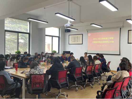 2022年3月24日下午两点四十分,太阳成集团tyc33455cc2021—2022学年第二学期第三次全体教职工大会于外语学院会议室召开。