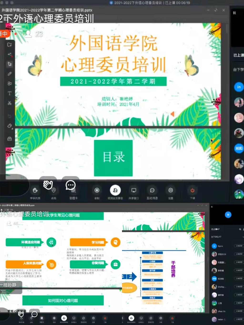 疫情防控常态化及春季心理疾病高发期大背景下,太阳成集团tyc33455cc于2022年4月1日下午13:00在线上举行心理委员培训会。本次会议由心理健康教育专员崔艳婷老师主持,21级和20级各班心理委员参加。