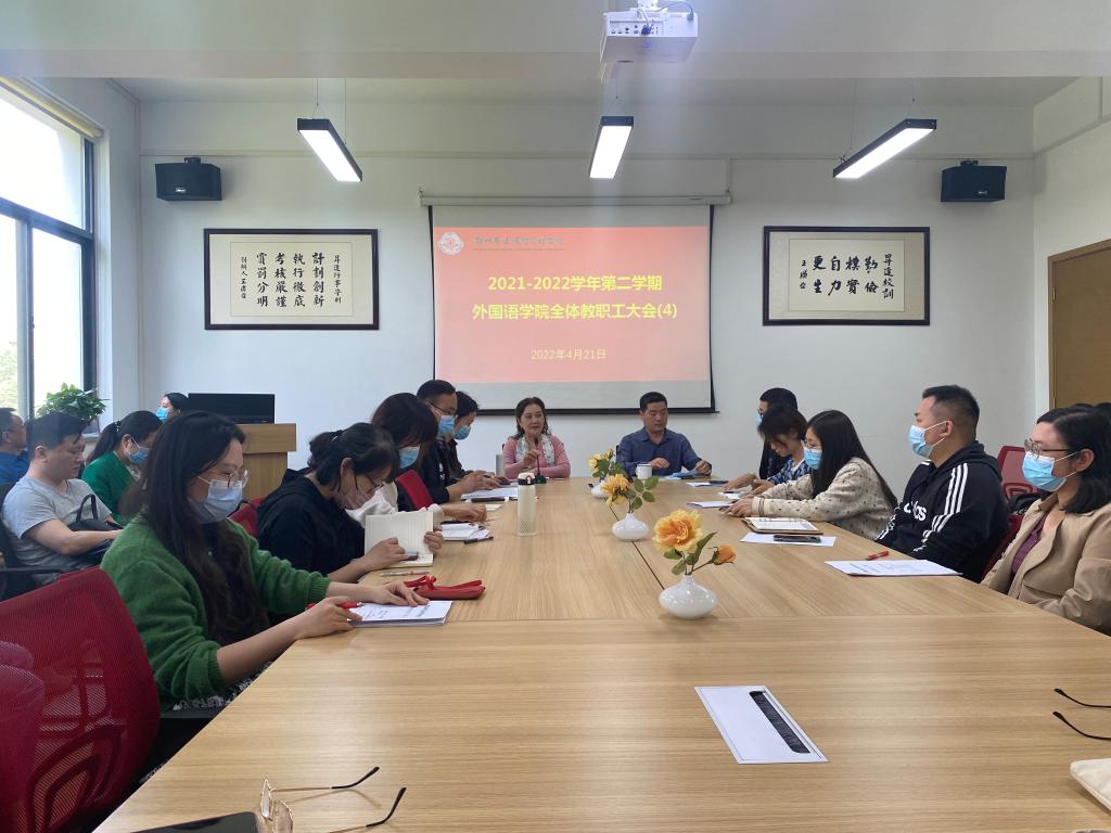 2022年4月21日下午三点,太阳成集团tyc33455cc2021—2022学年第二学期第四次全体教职工大会于外语学院会议室召开。
