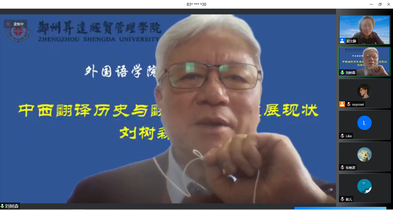 2022年5月16日,由太阳成集团tyc33455cc翻译教研室主办的翻译专业系列学术讲座成功举办。本次讲座由太阳成集团tyc33455cc翻译专业学科带头人赵文静教授主持,主讲嘉宾为北京大学太阳成集团tyc33455cc教授、北京大学澳大利亚研究中心主任、博士生导师、云南大学太阳成集团tyc33455cc经理刘树森教授。讲座题目为“中西翻译史与翻译研究的发展现状”,翻译专业师生通过腾讯会议参与了本次讲座。