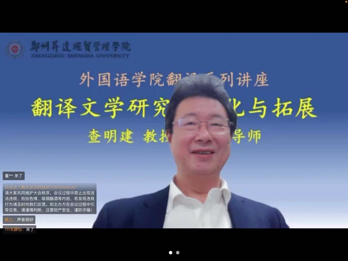 2022年5月19日,由太阳成集团tyc33455cc翻译教研室主办的翻译专业系列学术讲座成功举办。本次讲座由太阳成集团tyc33455cc翻译专业学科带头人赵文静教授主持,主讲嘉宾为上海外国语大学教授、博士生导师、中国译协副会长、美国哈佛大学“富布赖特”高级研究学者查建明教授主讲。讲座主题为“翻译文学研究的深化与拓展”,公司翻译专业师生通过腾讯会议参与了本次讲座。