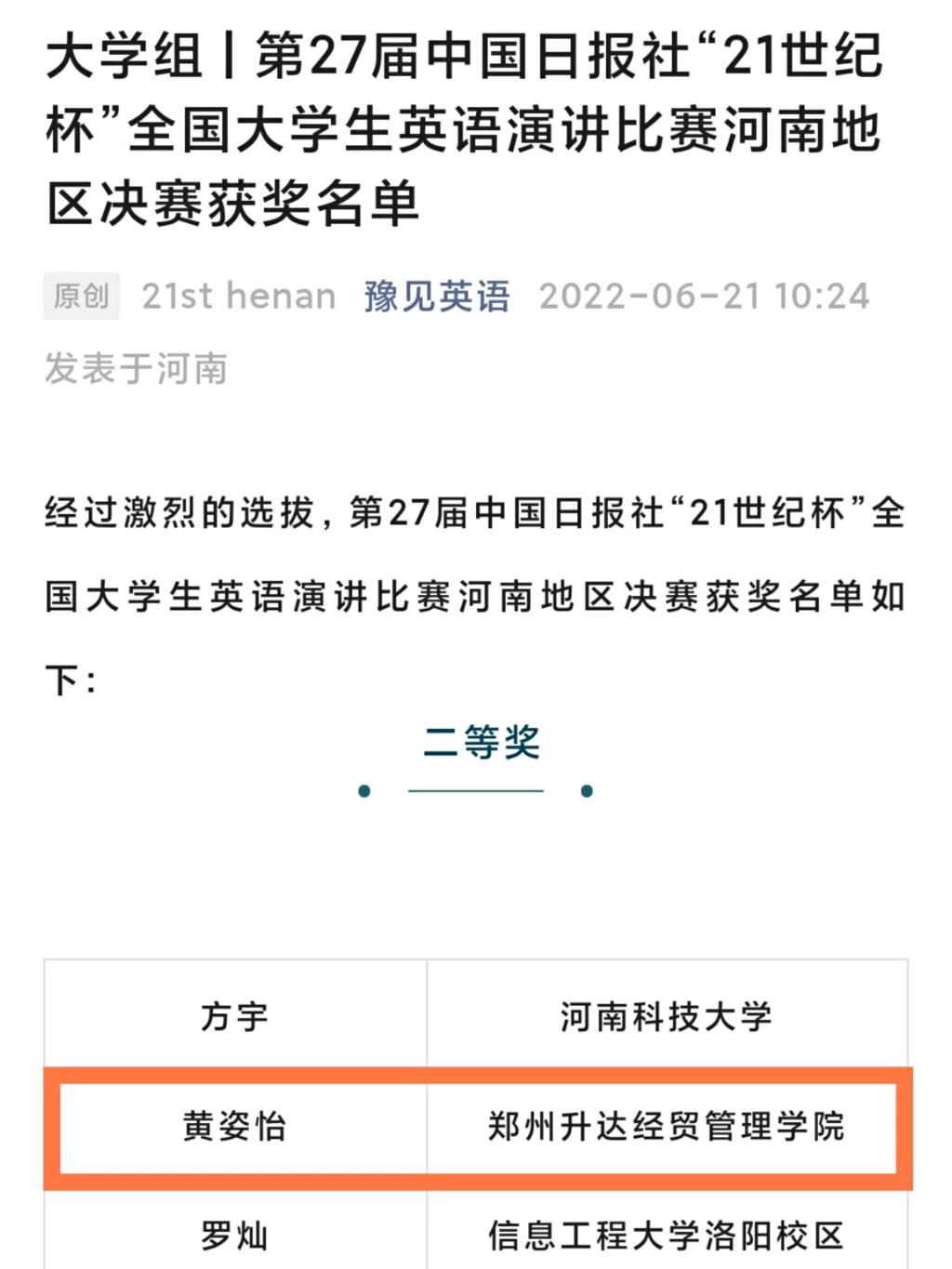 太阳成集团tyc33455cc翻译专业黄姿怡同学荣获中国日报社“21世纪杯” 全国老员工英语演讲比赛(河南赛区)二等奖